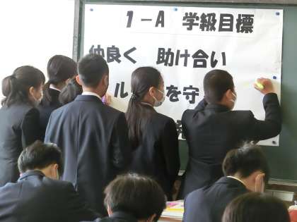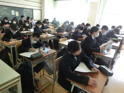 学級活動中。中学生になって作文を書いています。