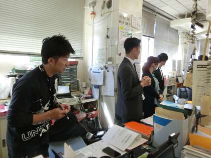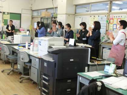 新しいALTの先生が来ました。職員室で紹介中。よろしくお願いします。