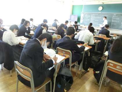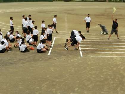 数学です。校庭では、50メートルの記録を計っています。みんな頑張れ!!