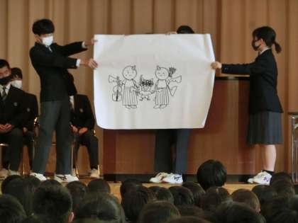 前期生徒総会3 5月1日(月) 公開日 2023/05/01 更新日 2023/05/01 校長室より 議事に入るままえに、昨年度募集した弦キャラの紹介がありました。 みんなの意見を合体させたそうです。 名前がまだないので、ロイロノートで募集するそうです。 いいね(0)