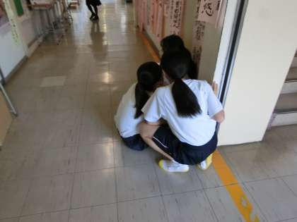副校長先生の緊急放送で、その場に避難をしました。みんな静かに、慌てることなく、落ち着いた行動が取れていました。昨日避難訓練があったばかりで、実践につながりました。