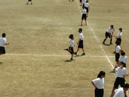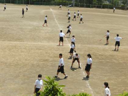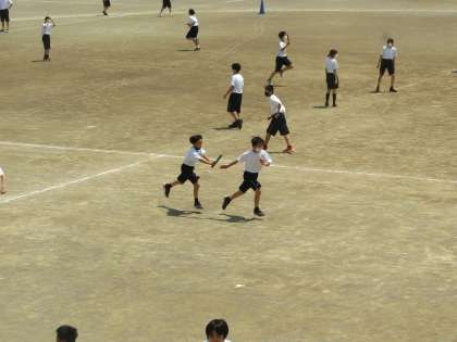 体育の授業。体育大会に向けてバトンパスの練習です。