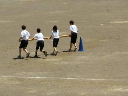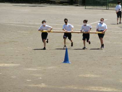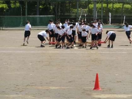 校庭では、体育の授業。体育大会の学年種目の練習をしている1年生です。