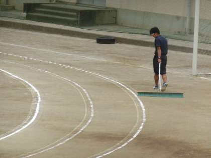 子どもたちがけがをしないように、合間の時間にトラック整備。ご苦労様です、沼田先生。