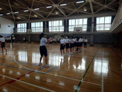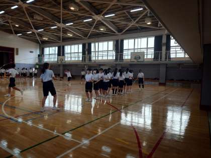 雨のため、校庭が使えないので、3年生の体育は体育館で大縄。