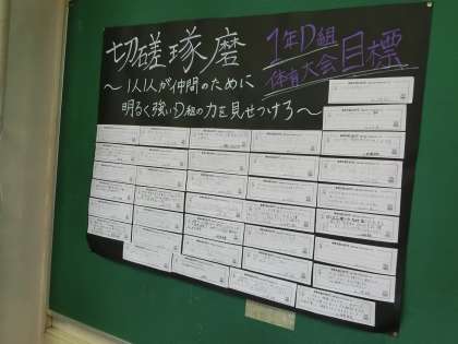 体育大会に向けて、一人一人が書いた目標のカードが、教室に掲示してありました。体育大会に向けてやる気がみなぎっていました。自分の目標に向けて、頑張ってください。