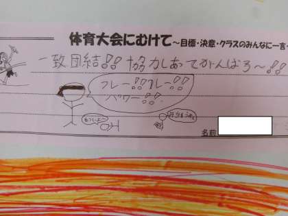 弦中生活(体育大会延期)8 6月3日(土) 公開日 2023/06/03 更新日 2023/06/03 校長室より 月曜日の体育大会にむけて、頑張ろう!!1年生の「体育大会に向けてカード」をよく読んでみました。いくつか紹介します。 いいね(0)