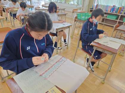 家庭科スエーデン刺繍、1年生もどんどん進んでます。