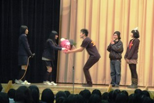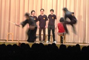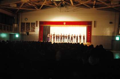 3月15日(木)に本校体育館において、卒業生に捧げるワンステージプレゼントとして、劇団「風雲かぼちゃの馬車」の皆さんによる公演が行われました。殺陣やダンス、ミュージカルなどが盛り込まれた楽しいお芝居で、生徒たちは皆身を乗り出して見入っていました。また、劇団の方々がご自分の進路をどのように切り開いてきたのかというお話をうかがうこともできました。素敵なお芝居とお話をしていただき、本当に有り難うございました。