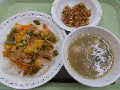 豚キムチ丼には夏野菜としてピーマンと枝豆、彩りとしてパプリカが入っています。