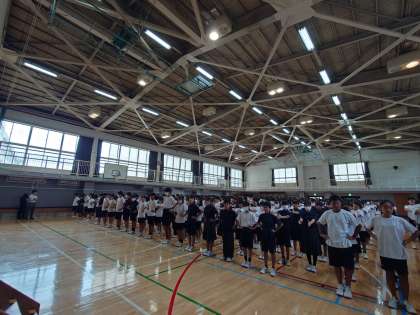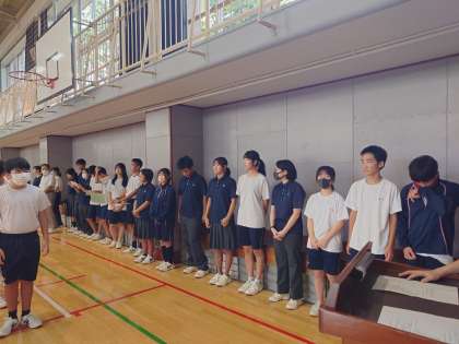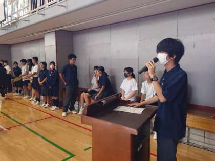 生徒会朝礼で、会長、各委員会の委員長が発表会しました。
