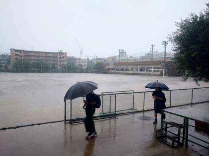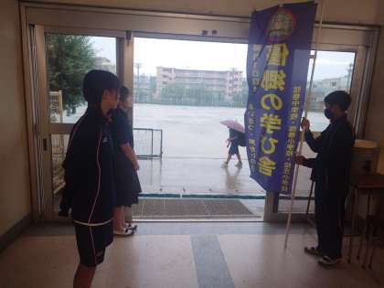 二学期はじまって、台風の中のあいさつ運動でした。前期生活委員の最後のあいさつ運動ですね。ご苦労様でした。