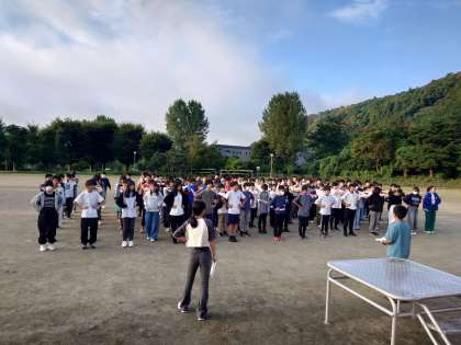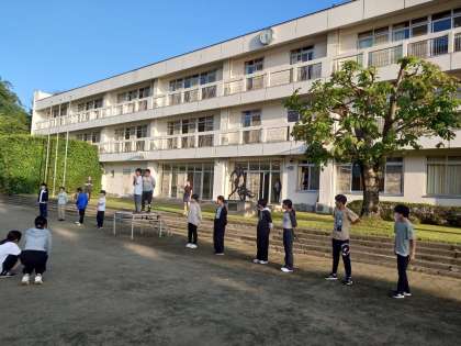 点呼が終わりました。朝礼が始まります。学園長のおはようございますの挨拶に、元気におはようございますが返ってきました。