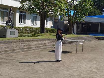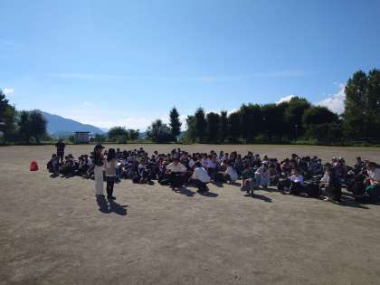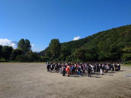 お部屋の掃除、布団の整理整頓です。部屋チェックを受けた部屋から荷物を持って園庭へ。