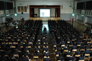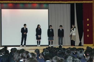4月14日(土)、本校体育館においてマナー講演会が行われました。本校の新標準服をデザインした会社の方が講師をしてくださり、「標準服の役割・機能・着こなし」などについてお話していただきました。また、代表生徒による実演を通して、新旧両方の標準服の正しい着こなしを学ぶことができました。