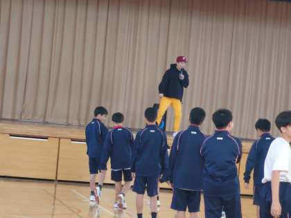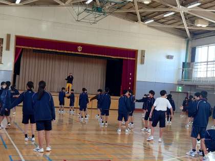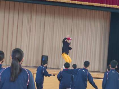 ダンス一年生1 11月14日(火) 公開日 2023/11/14 更新日 2023/11/14 できごと ダンスの授業が始まりました。 1年生はスタートアップの授業に、プロダンサーのARATAさんに来てもらいました。 ダンスバージョン弦中校歌に振り付けをしてもらったARATAさんに教えてもらいます。 いいね(0)