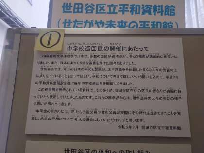 世田谷平和資料館中学校巡回展示1 12月5日(火) 公開日 2023/12/06 更新日 2023/12/06 できごと 三年に一度中学校で行われる巡回展示が12月5日から第1会議室で始まりました。 いいね(0)