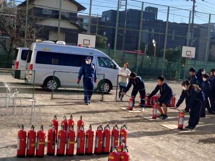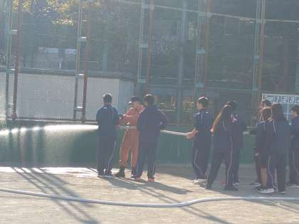 防災訓練中1 12月9日(土) 公開日 2023/12/10 更新日 2023/12/10 できごと 1年生とI組では、毎年、講演会のあと、防災訓練を行います。今年も初期消火、煙中訓練、地震体験、放水訓練を行いました。 いいね(0)