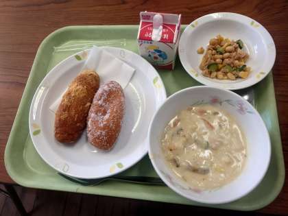 最後のリクエスト給食。弦中生みんなが大好きなメニュー、揚げパン2色。3年生は最後の