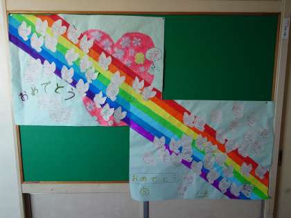 教室では、笑顔でメッセージボードに書く3年生がいました。