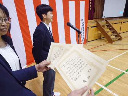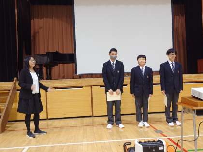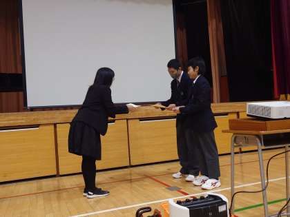修了式のあと、2年生の学年集会があり、学年レクの表彰を行いました。