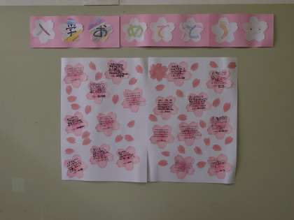 廊下には、一年生を歓迎する入学おめでとうメッセージの書かれた模造紙が貼られていました。