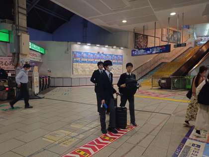 私は渋谷から京急に乗って、羽田に向かいます。品川の乗り換えで、弦中生に遭遇。
