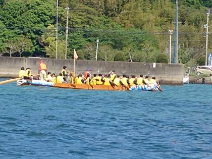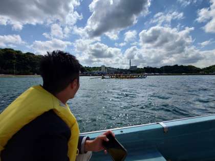 船からクラスを熱く応援する担任の先生です。