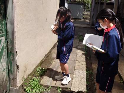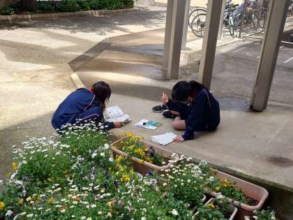 1年生、理科の授業。春の生き物観察中。