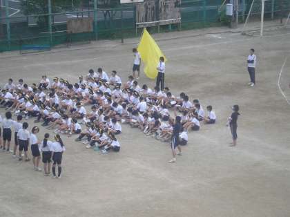 写真は、一年生から3年生まで各クラスが合同で行う応援合戦の練習風景です。