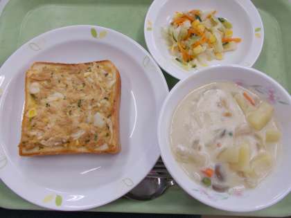 5月13日・14日の給食 公開日 2024/05/14 更新日 2024/05/14 給食 5月13日の献立 ・ツナトースト ・クリークシチュー ・コールスローサラダ 5月14日の献立 ・わかめご飯 ・切り干し大根入り卵やき ・おひたし ・ゴマ味噌汁 切り干し大根はにんにくやネギと一緒に炒め、オイスターソースで味付けしたものを卵焼きの具にしています。切り干し大根の独特な匂いがあまりないので食べやすいかと思います。 いいね(0)