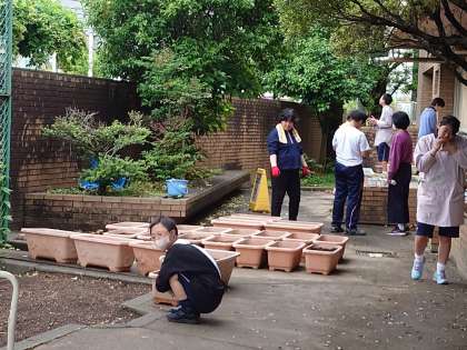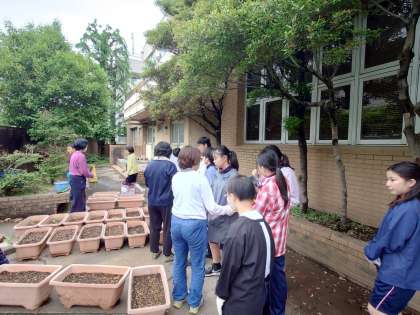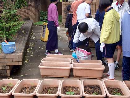 I組での作業の授業です。栽培が始まります。まずは、プランターの土づくりです。