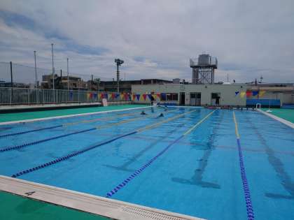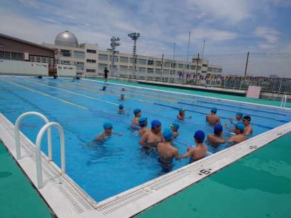 水泳の授業です。水温も高くなっているので、水を入れて冷やして対策をとっています。