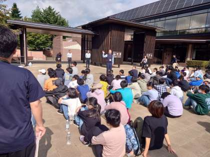 富士山世界遺産センター到着。係の方からのお話をしていただか、班ごとに見学です。