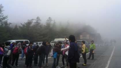 奥庭荘の駐車場に着きました。ガスで視界が悪いですが、元気に散策します。