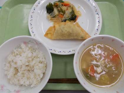 10月10日の給食 公開日 2024/10/10 更新日 2024/10/10 給食 10月10日の献立 ・麦ごはん ・ジャンボぎょうざ ・春雨サラダ ・豆腐スープ ジャンボぎょうざは毎年リクエストメニューに選ばれる人気のメニューです。 職場体験に来ている生徒にはギョウザを包む作業をしてもらいました。 いいね(0)