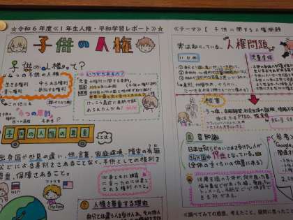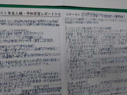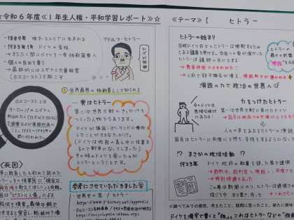 弦中生活4 11月9日(土) 公開日 2024/11/10 更新日 2024/11/10 できごと 人権平和レポートのテーマは、様々です。第一次世界大戦、太平洋戦争、第二次世界大戦、その中の沖縄戦、ヒトラーなど、過去の戦争についてのテーマ、その他にも子供の人権、犯罪被害者の人権など、現代の人権課題を含まれます。 よく調べてまとめてあります。 いいね(0)