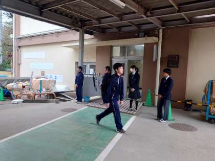 今日のあいさつ運動は、雨のため室内で行いました。