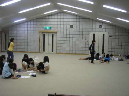 学園の学習室を中心に活動です。グループごとに劇の内容、せりふを考えて、創作劇をつくります。2日目の夜に途中経過を発表し、部員同士で意見交換。鋭い意見とそれを素直に聞き、「ありがとう」と受け入れる姿が印象的です。3日目の夜は合宿参加の他の部活の生徒へ向けての発表会。短い時間によく組み立てているなと感心しました。