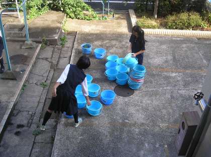 朝、多くの生徒がボランティアとして集り、バケツやペットボトルに入れた水を