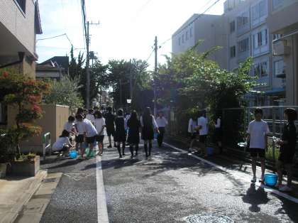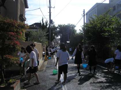学校周辺の道路にまきました。気持ち・・・、ひんやりしてきました。
