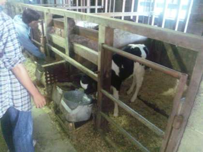 こちらでは子牛の世話をしています。さっきしぼった乳を子牛に飲ませます。