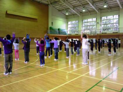 2日目の朝です。天気は少し雨が降ってきたので朝礼は体育館でおこなっています。