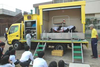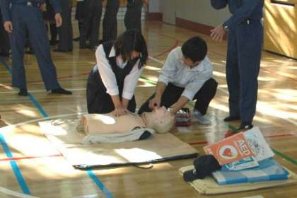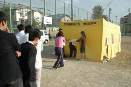 10月15日(月)、優郷の学び舎避難訓練の終了後、引き続き「避難所運営訓練」を行いました。災害時の避難所開設へ向けて、「弦巻スチューデント・エイド」(生徒による被災者救援隊)を募り、地域・保護者の方々と連携して、「消防ポンプの取り扱い」「仮設トイレの組み立て」「AEDを使った心肺蘇生」「車椅子の操作方法」「炊き出し」などを訓練をしました。また、救援隊以外の生徒たちも起震車体験や煙中体験を行いました。今後も災害時の自助・共助の力をつけ、防災・減災の意識を高めていきたいと思います。