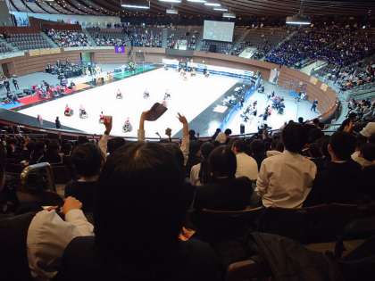 車椅子ラグビー応援7 11月19日(火) 公開日 2024/11/20 更新日 2024/11/20 できごと 試合前のアナウンスが入り、会場が盛り上がってきました。電光掲示版に弦中生も映し出されます。 いいね(0)