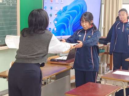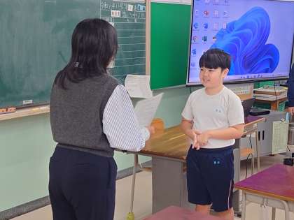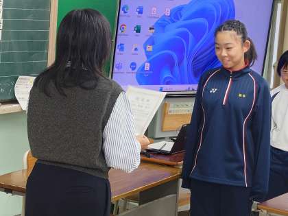 I組では、合同マラソン大会の表彰式を行いました。1.5 キロを走りきることができました。完走賞おめでとう。