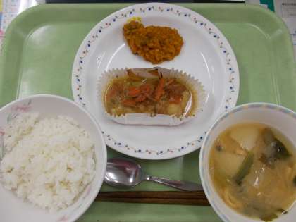 今日は家庭科との企画で、2年生の夏休みでの宿題「家族に夕食を作ろう〜一汁三菜〜」から2Dの生徒の献立を給食にアレンジしました。