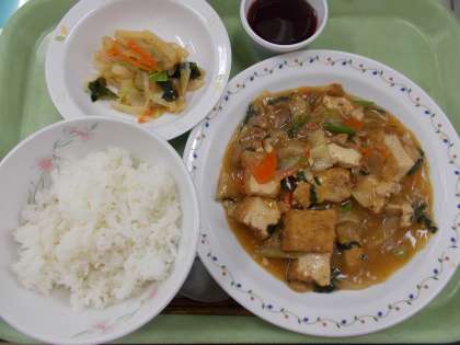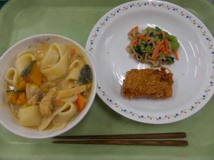 12月19日・20日の給食 公開日 2024/12/20 更新日 2024/12/20 給食 12月19日の献立 ・ご飯 ・家常豆腐 ・大根サラダ ・ぶどうゼリー 家常豆腐(ジャージャンどうふ)は生揚げの入ったピリ辛な煮物です。 12月20日の献立 ・ほうとう ・イカのさらさ揚げ ・ごまあえ 明日、12月21日は冬至になります。冬至には「ん」がつく食べ物がよいとされ、「なんきん」であるかぼちゃを食べる風習があります。 いいね(0)