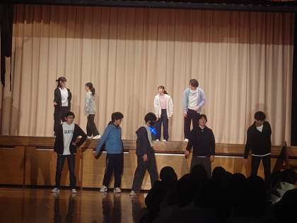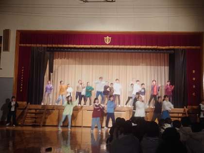 B組の発表が始まります。クラス紹介。全員で踊る校歌ダンス。そして、グループダンスが続きます。