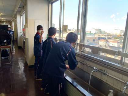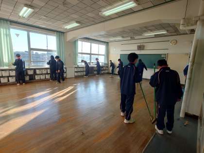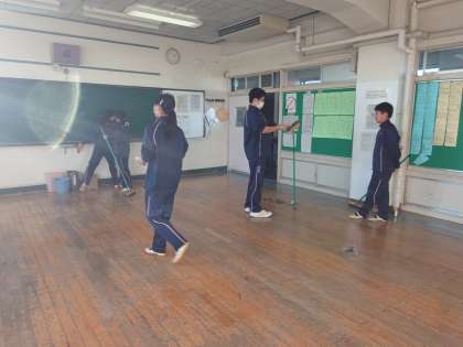 教室も徹底的に。水は冷たいけど、頑張ります。